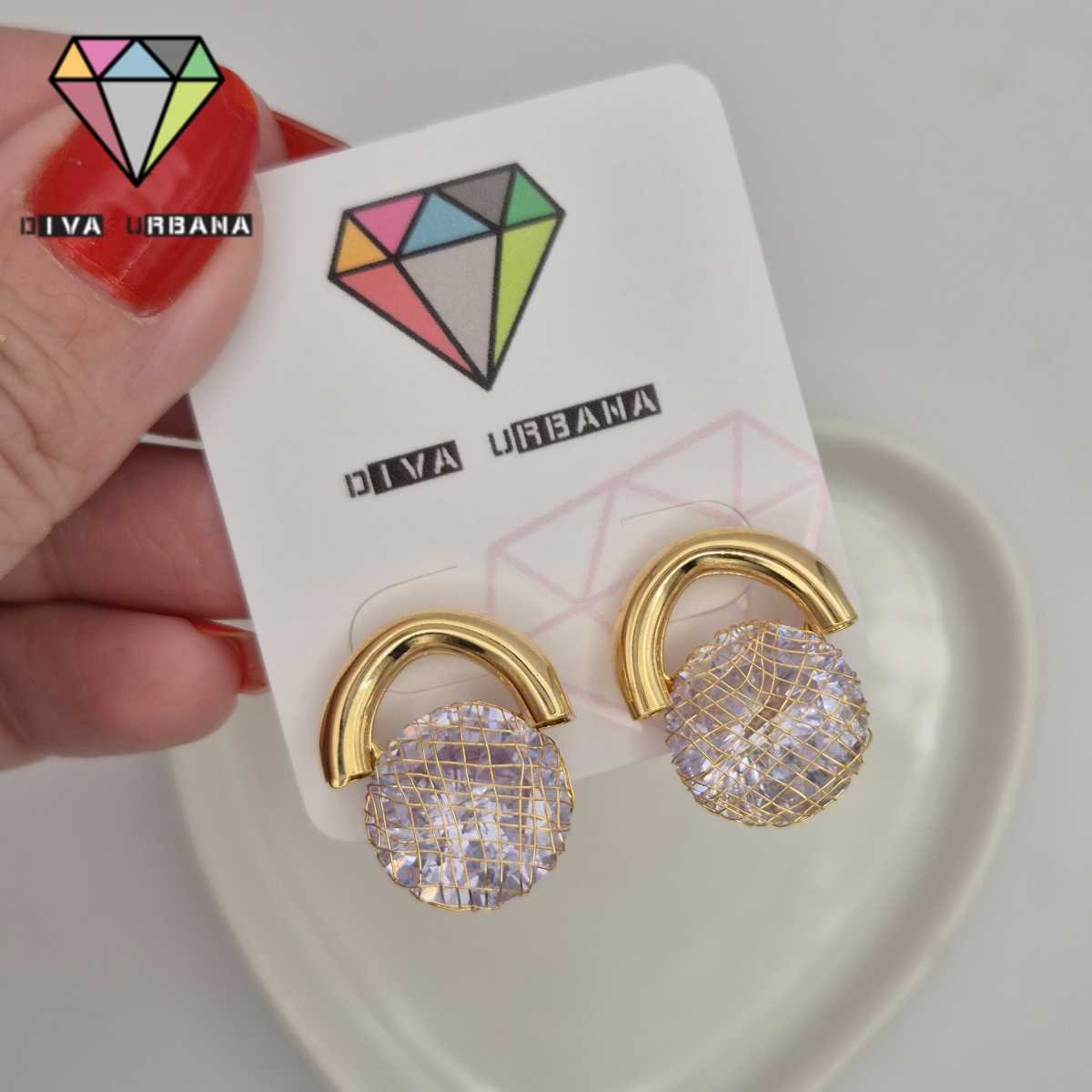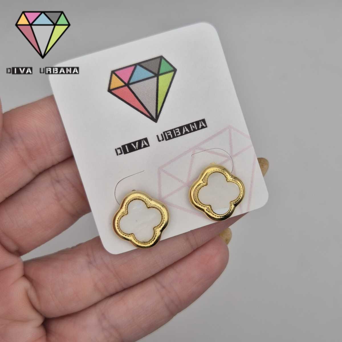 B8657 BRINCO PINO TREVO OPALA BRANCO BORDA DOURADA