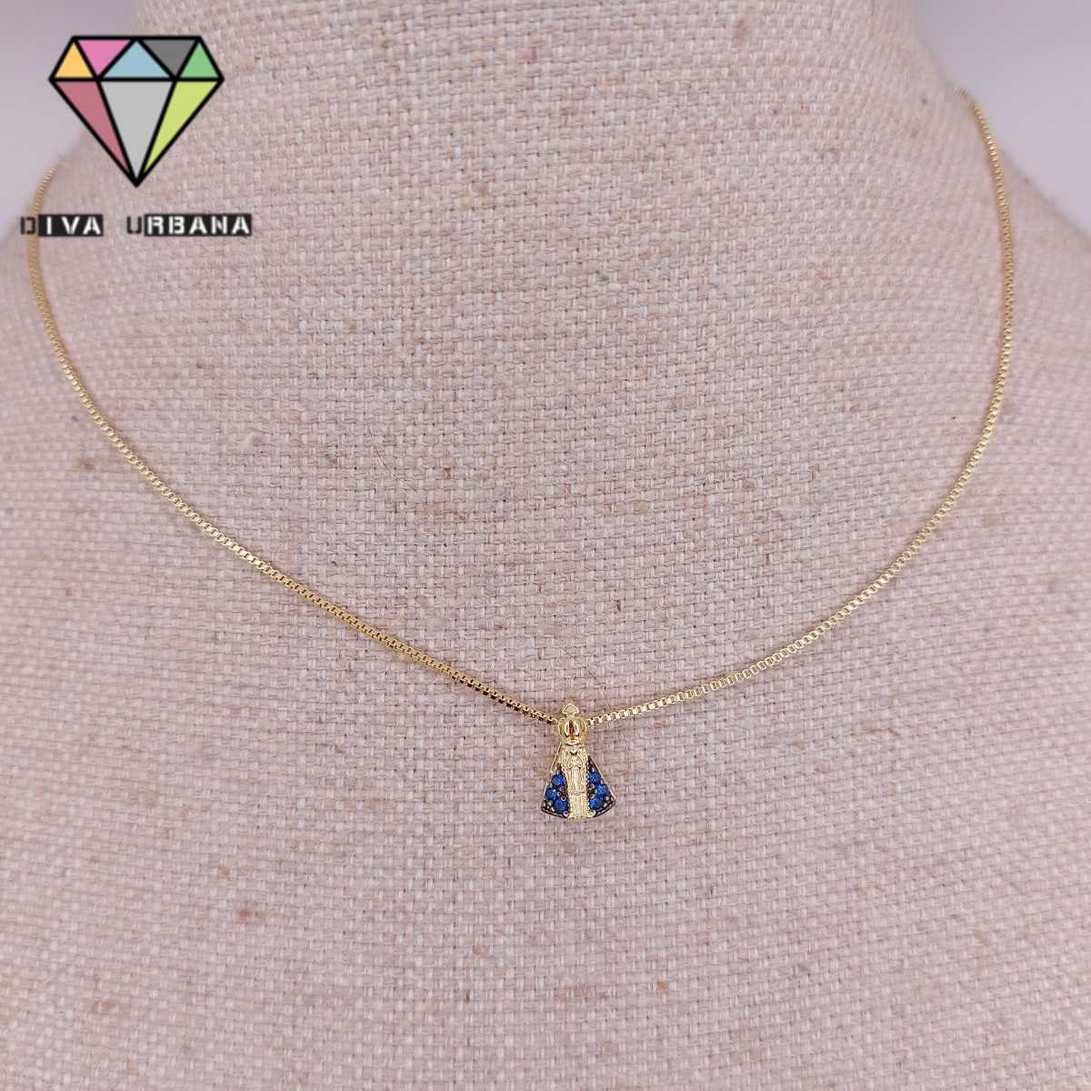 C3887 COLAR VENEZIANO NOSSA SENHORA DOURADA ZIRC AZUIS