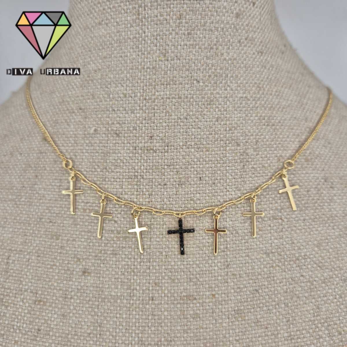 C4078 COLAR ELO GRUMET DELICADO CRUZES DOURADAS/ CRUZ CRAV ZIRC NE