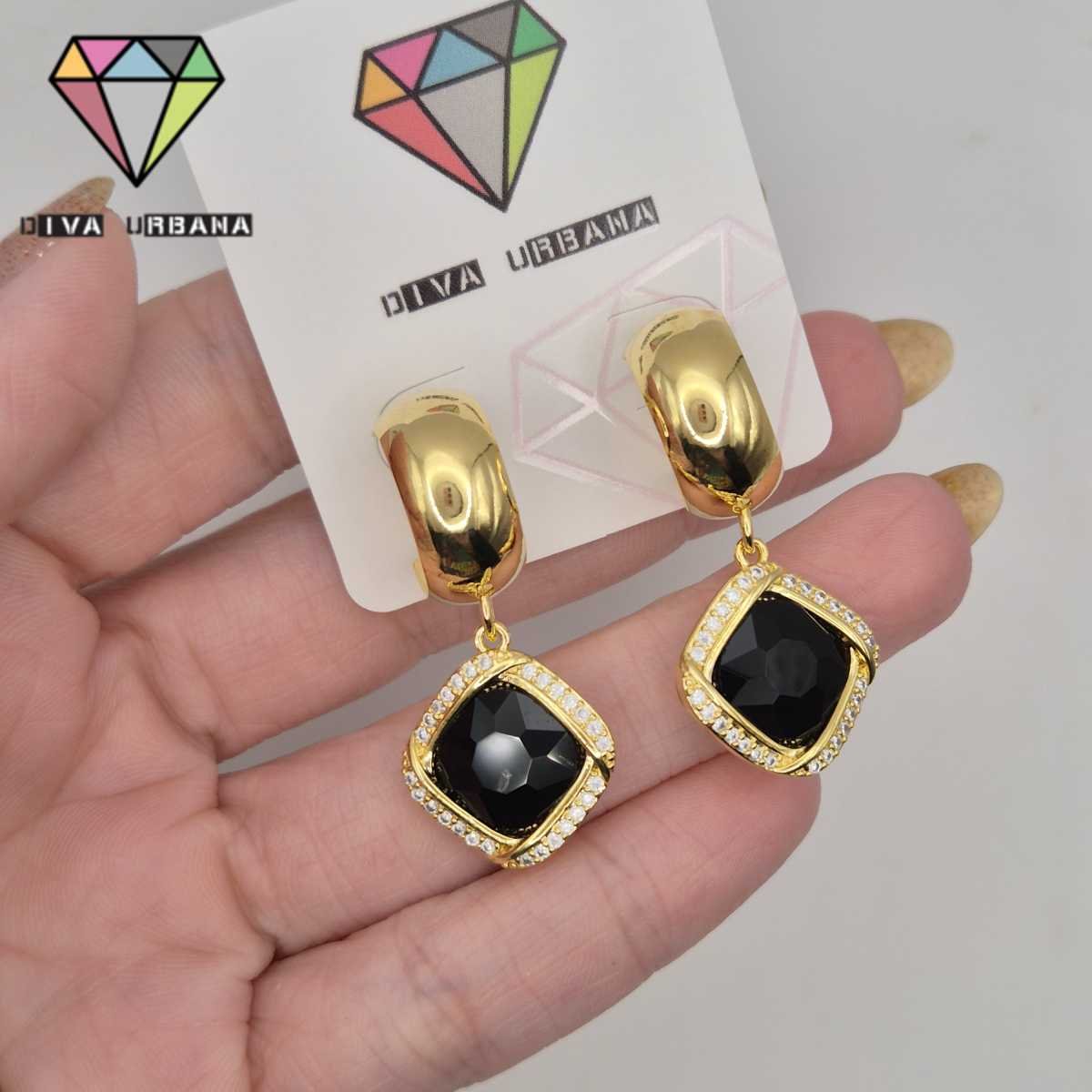 B8567 BRINCO PINO ARGOLA DOURADA PENDULO QUADRADO PRETO CRAV ZIRC