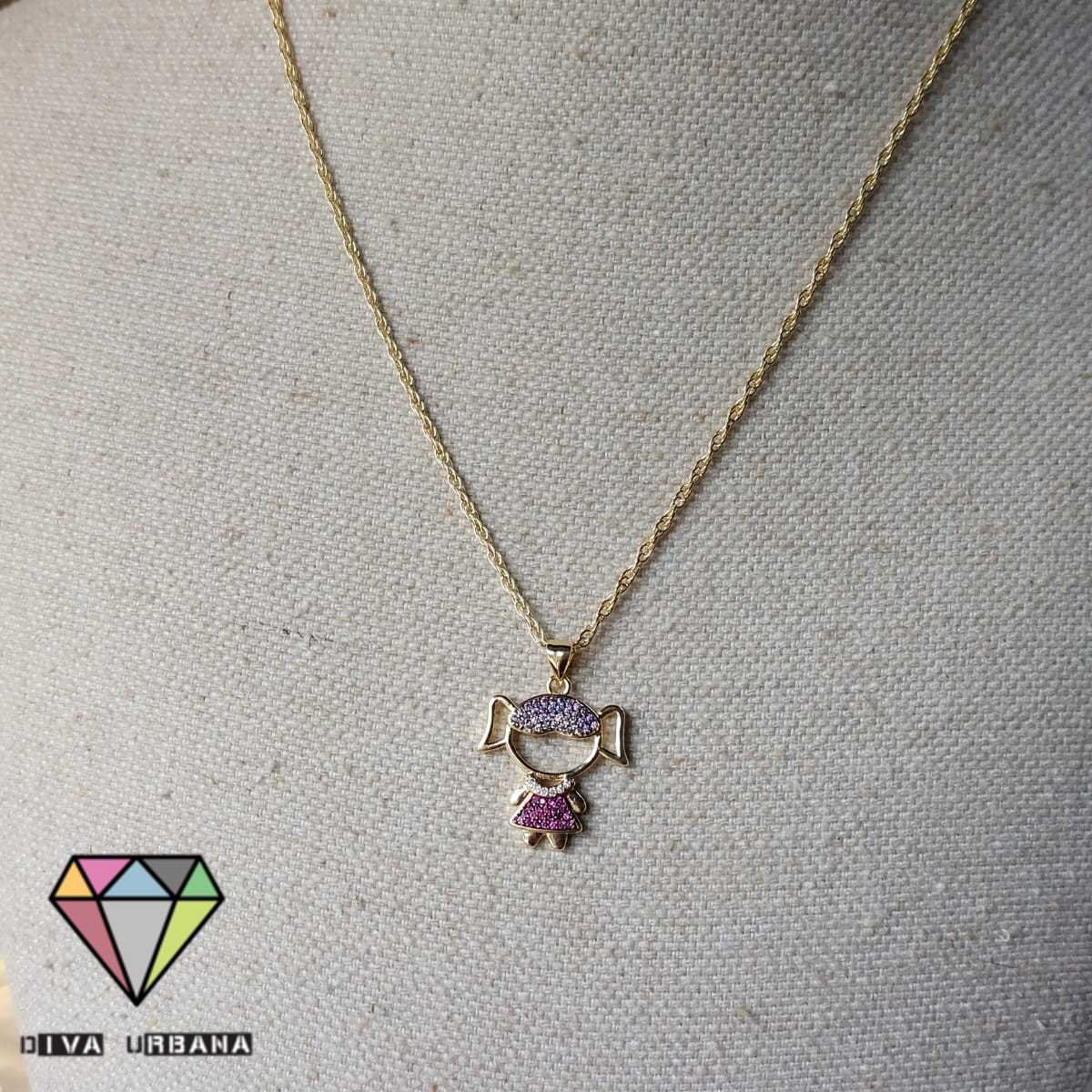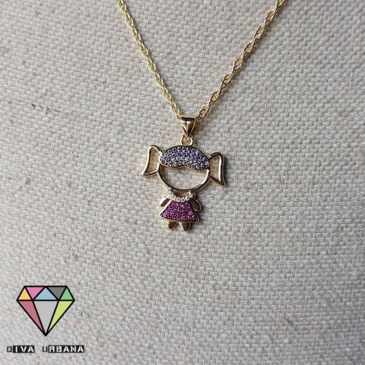 C3044 COLAR VENEZIANO DOURADO CANGA DUAS MENINAS ZIRC COLORIDAS