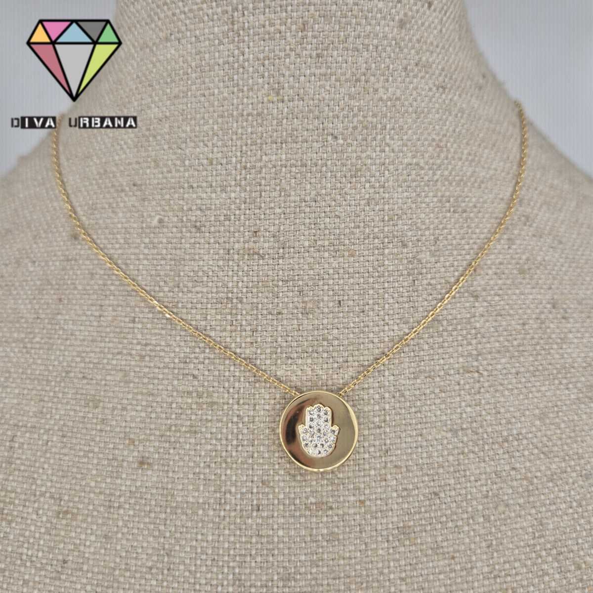 C4079 COLAR ELO AMERICANO MEDALHA MAO DE HAMSA CRAV ZIRC CRISTAL