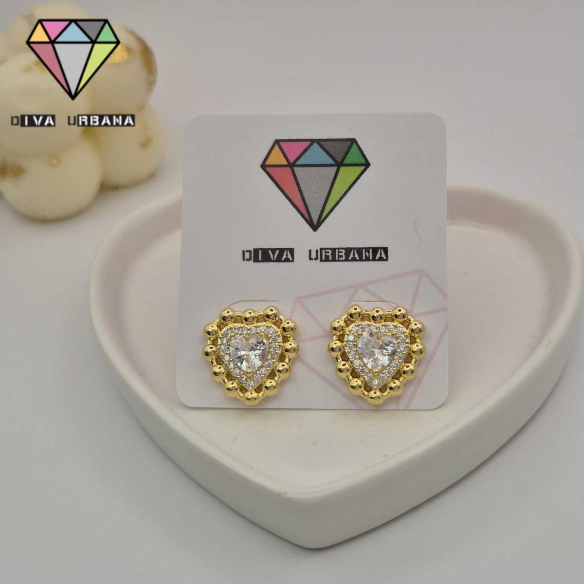 B7364 BRINCO PINO CORACAO ZIRC CRISTAL BORDA ESFERAS DOURADAS
