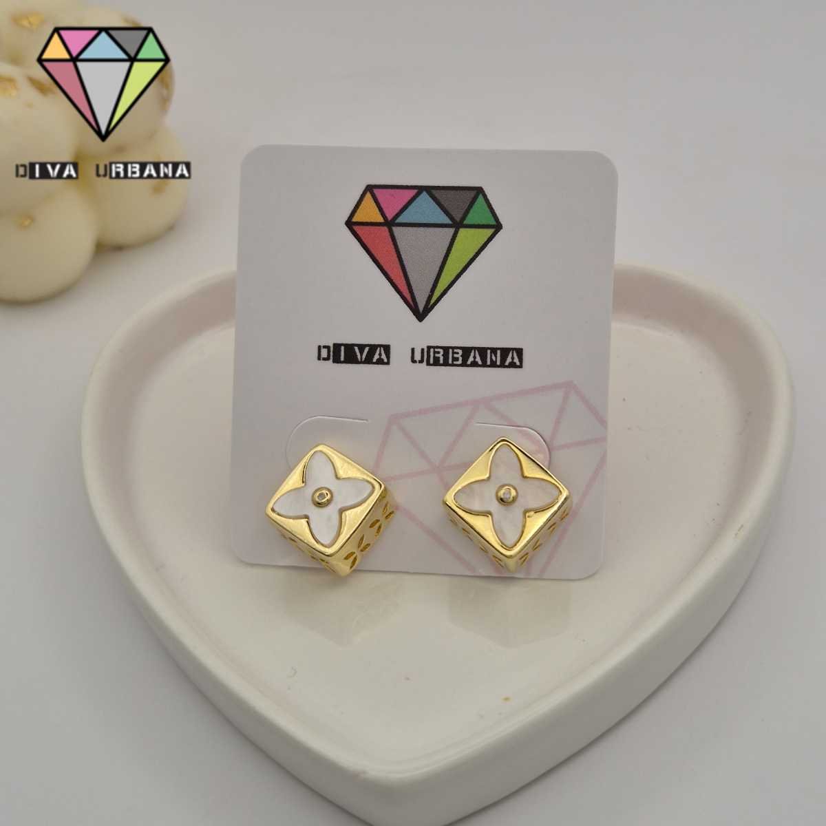 B7373 BRINCO PINO LOSANGO DOURADO FLOR MADREPEROLA