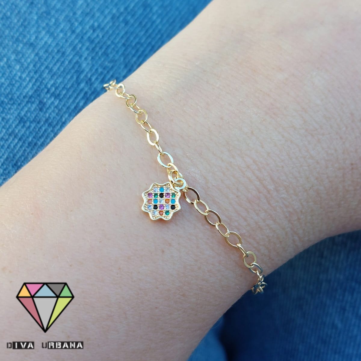 P1161 PULSEIRA ELO DELICADO PINGENTE FLOR CRAV ZIRC COLOR