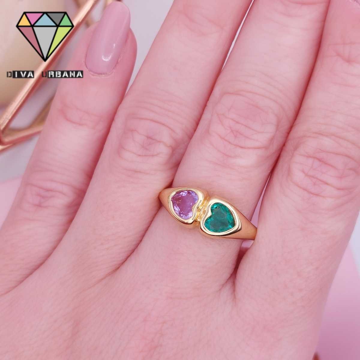 A1193 ANEL DOURADO DOIS CORAÇÕES VERDE/LAVANDA