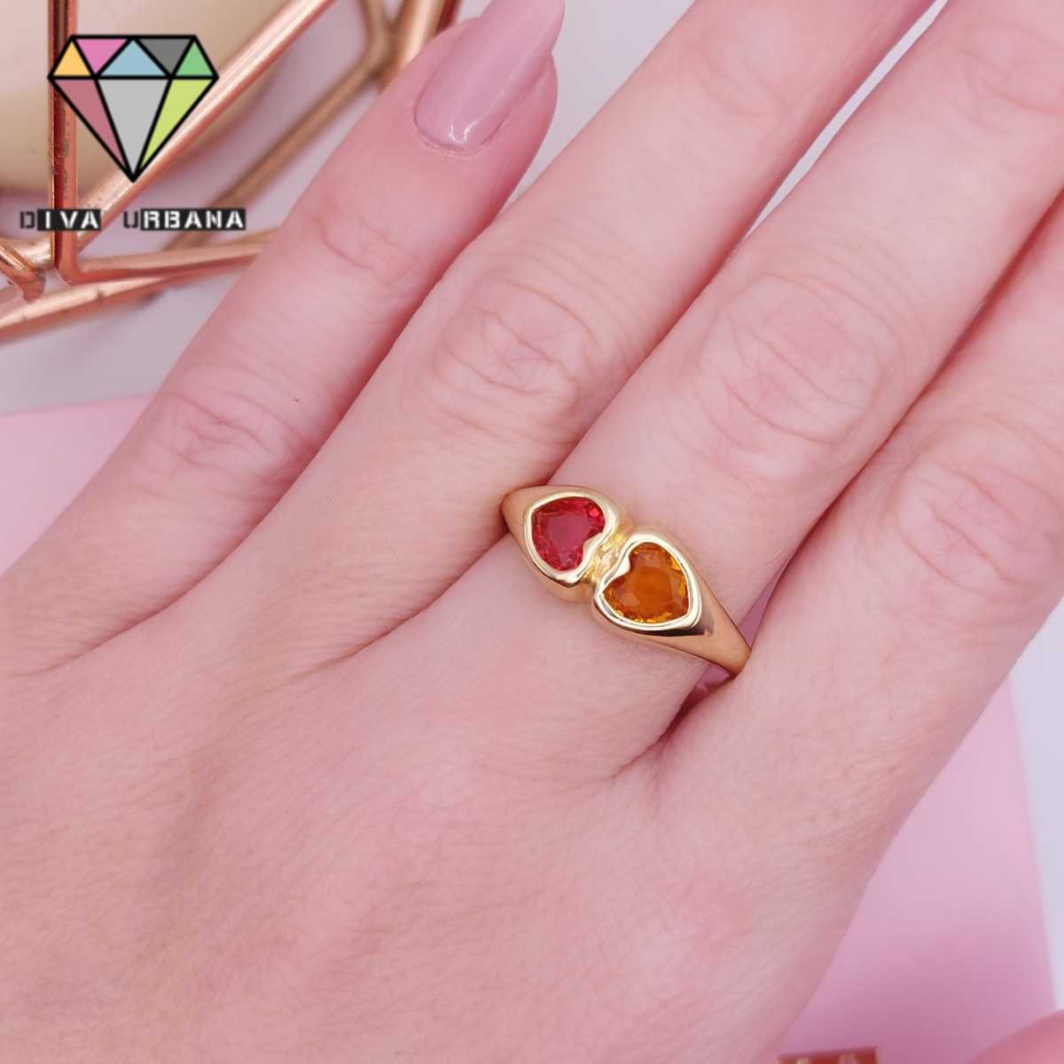 A1195 ANEL DOURADO DOIS CORAÇÕES AMARELO/VERMELHO