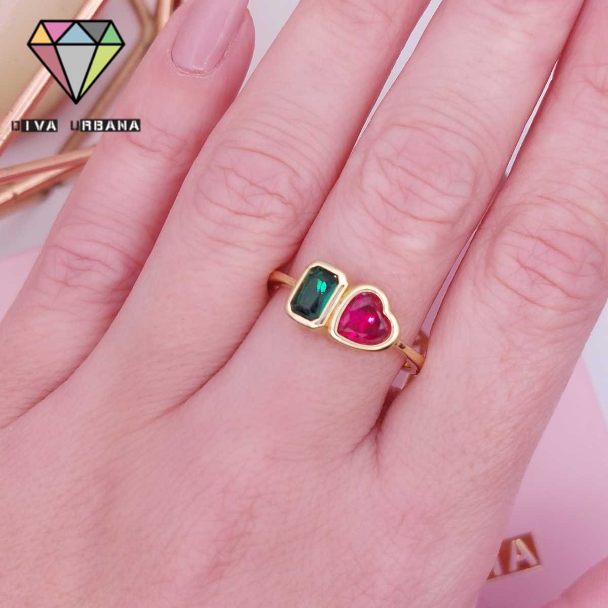 A1198 ANEL DOURADO QUADRADO VERDE CORAÇÃO VERMELHO