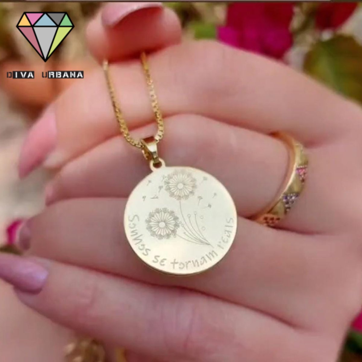 C2034 COLAR MEDALHA FLOR DENTE DE LEAO MANUSCRITO