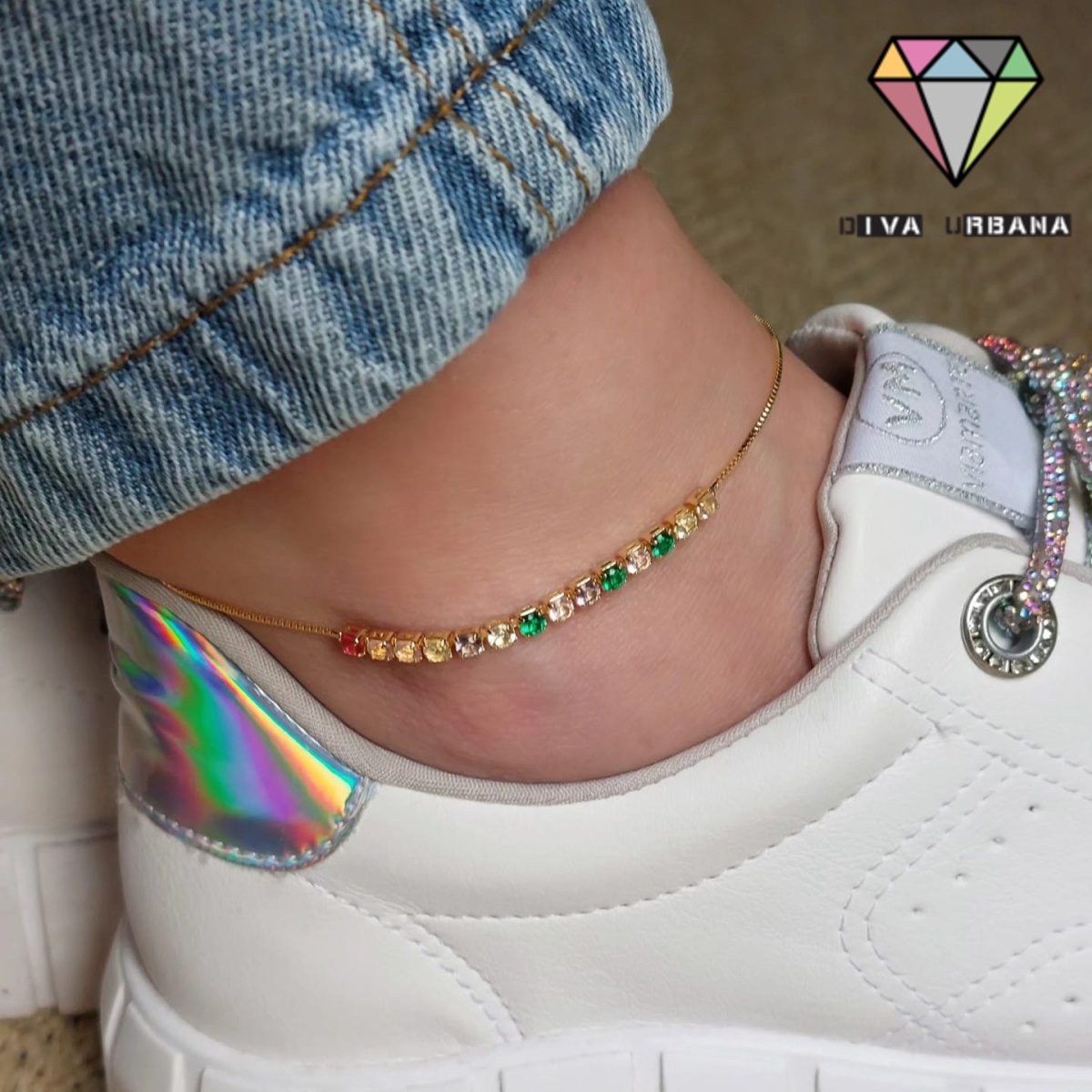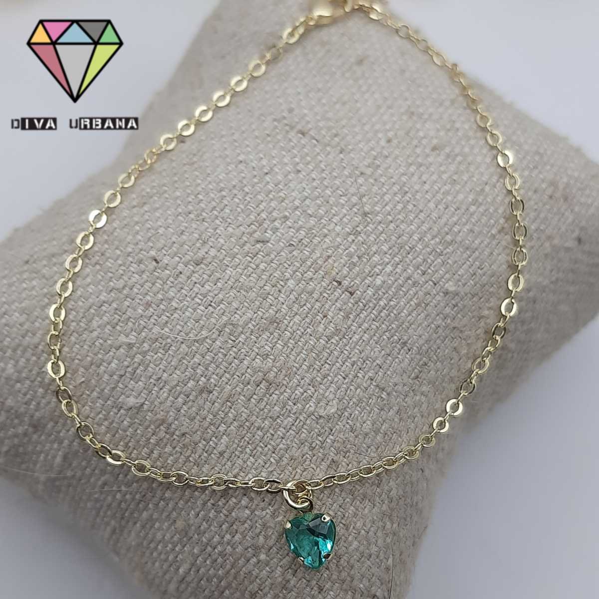 T0244 TORNOZELEIRA ELO AMERICANO PEDRA CORACAO VERDE AGUA