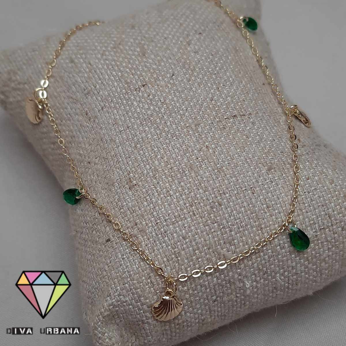 T0199 TORNOZELEIRA TRES GOTAS ZIRC VERDE E TRES CONCHAS DOURADAS