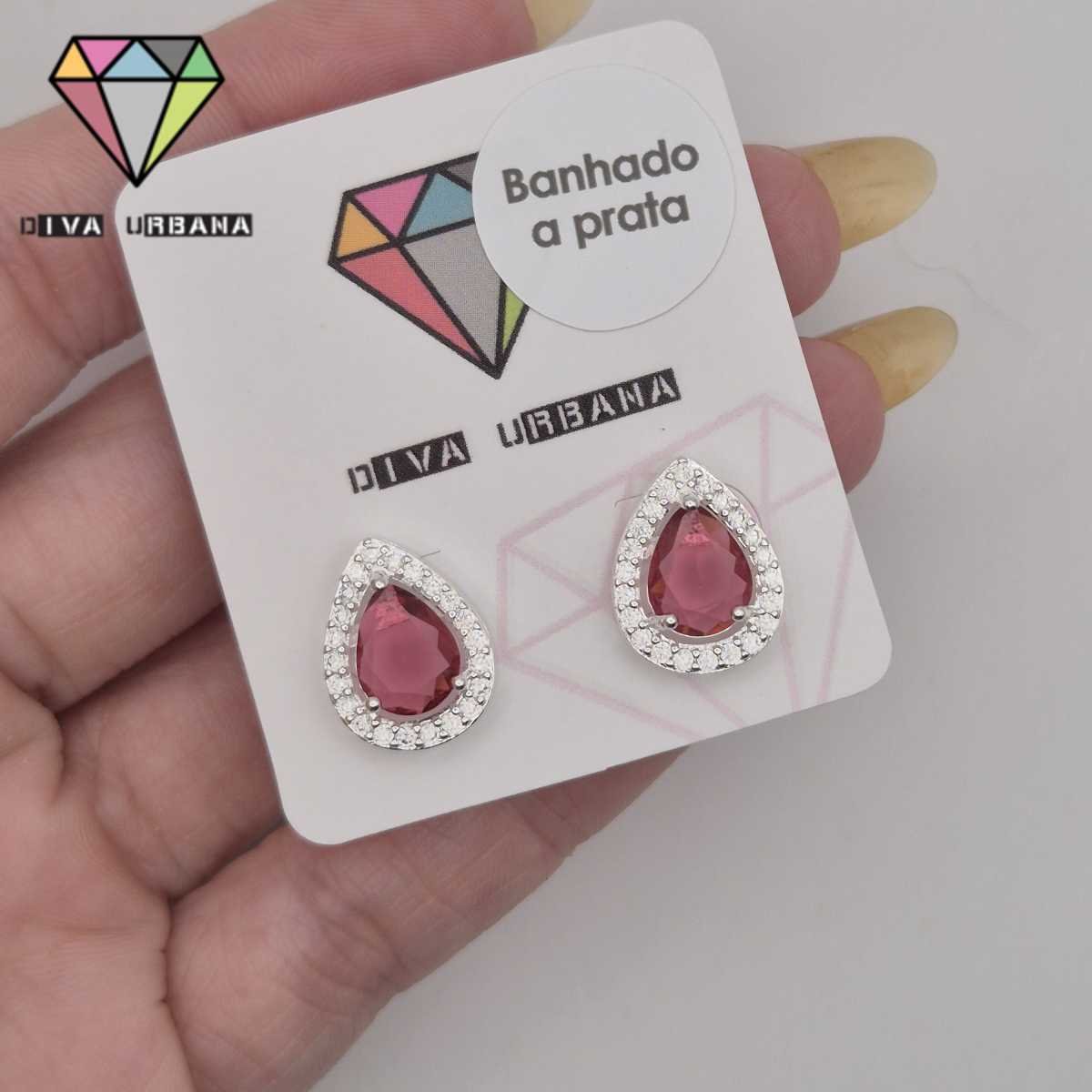 B8737 BRINCO BANHADO A PRATA GOTA RUBI CRAV ZIRC CRISTAL